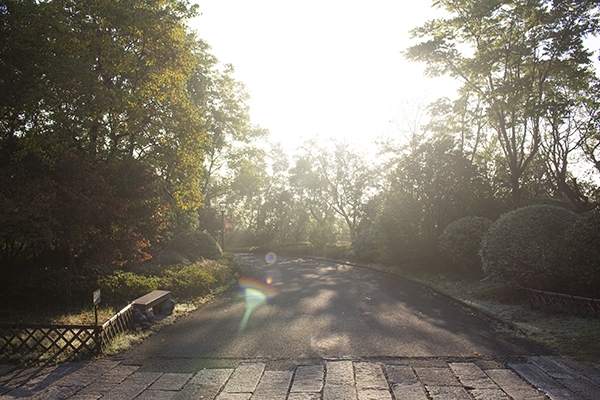 小鎮(zhèn)還未蘇醒,我們?nèi)ビ舆@份晨光,清晨的太陽冉冉升起,蔚藍(lán)色的天空分外惹眼,這份色彩是我們平日難以見到的光景。太陽是那么耀眼,你沒辦法與他對視,透過指縫,穿過林間,照耀在大地,石階小板抹上了斑駁的金色,所以你才知道,“嗯,太陽,他原來就在那里?!?